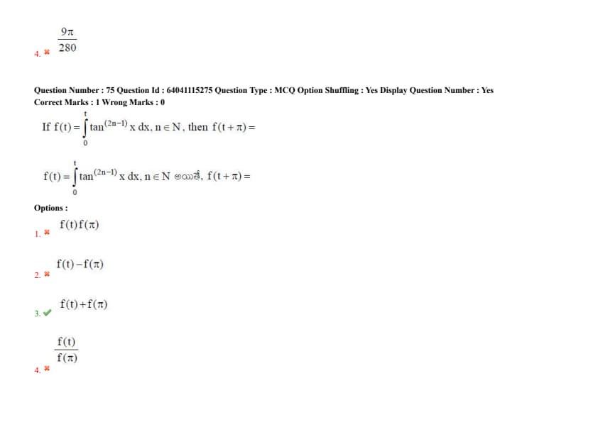 If \( f(t) = \int_0^t \tan^{2n-1}(x) \, dx \), \( n \in \mathbb{N} \), then \( f(t + \pi) =\)