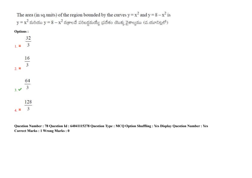 The area (in sq. units) of the region bounded by the curves \( y = x^2 \) and \( y = 8 - x^2 \) is