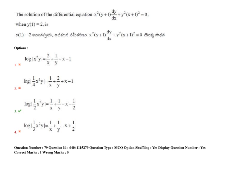 The solution of the differential equation \( x^2 (y + 1) \frac{dy}{dx} + y^2 (x + 1) = 0 \), when \( y(1) = 2 \), is