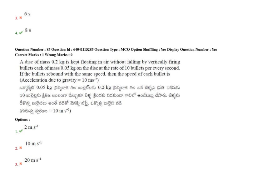 A disc of mass 0.2 kg is kept floating in air without falling by vertically firing bullets each of mass 0.05 kg on the disc at the rate of 10 bullets per every second. If the bullets rebound with the same speed, then the speed of each bullet is (Acceleration due to gravity = 10 m/s\(^2\))