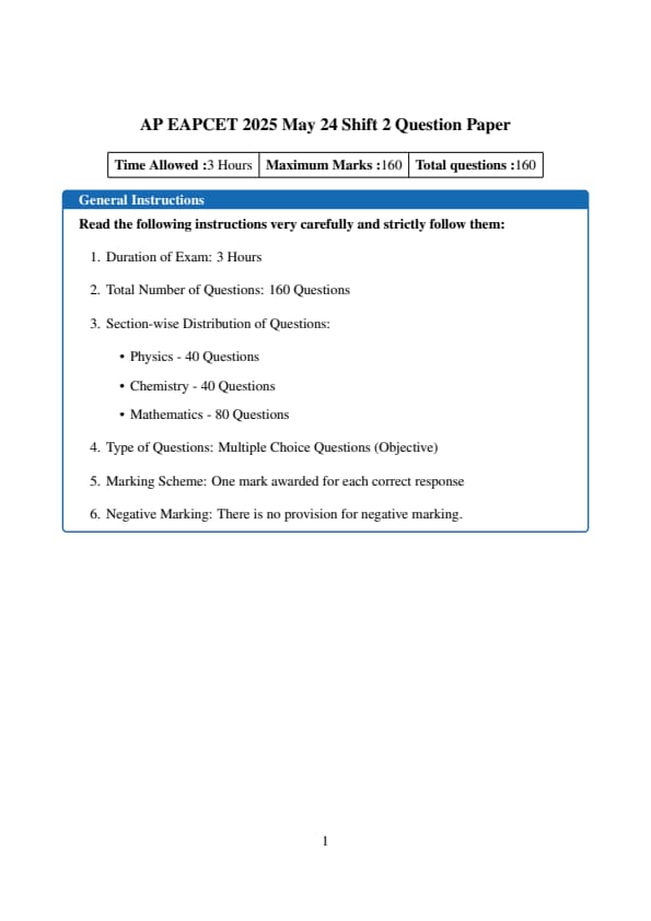 The AP EAPCET 2025 Question paper has 160 MCQs, each with 1 mark and without negative marking, with a total time duration of 3 hours.