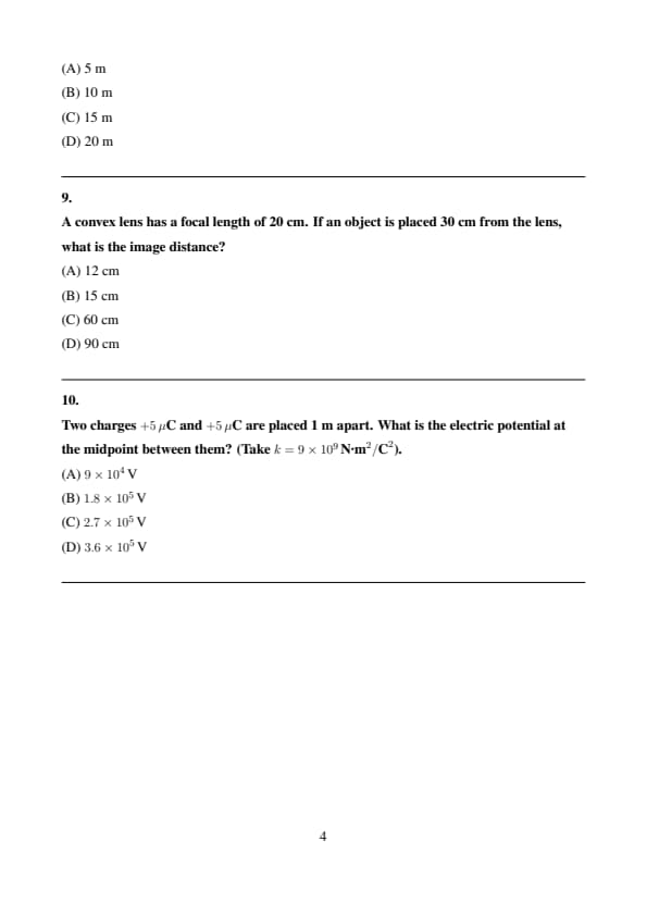 Two charges +5 μC and +5 μC are placed 1 m apart. What is the electric potential at the midpoint between them? (Take k = 9 × 109 N·m2/C2).