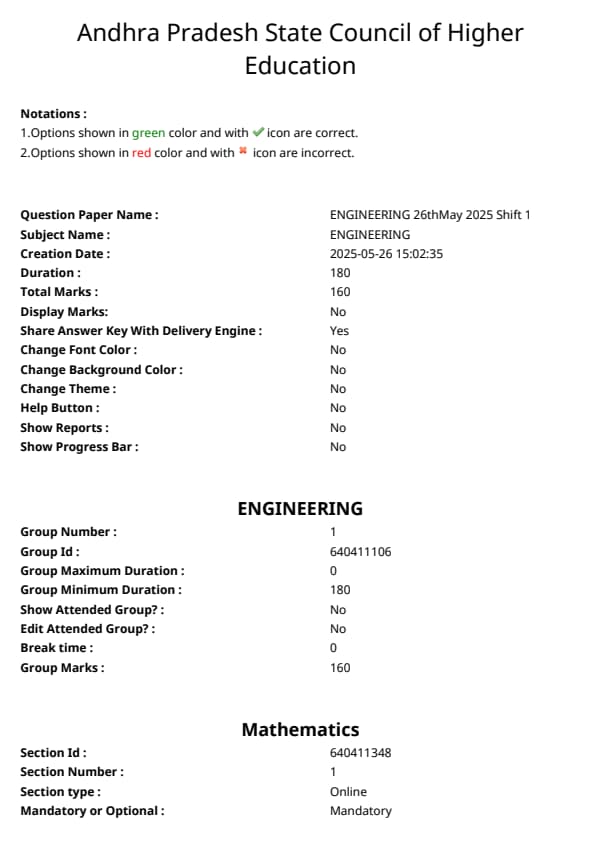 The AP EAPCET 2025 May 26th Question Paper, along with the Answer key, is available here. The AP EAPCET 2025 Question Paper includes 160 MCQs, each correct answer will carry 1 mark without any negative marking.