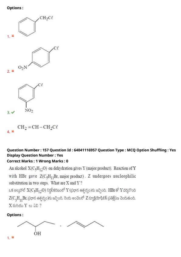An alcohol X \(\mathrm{C_5H_{12}O}\) on dehydration gives Y (major product). Reaction of Y with HBr gave Z (\(\mathrm{C_5H_{11}Br}\), major product). Z undergoes nucleophilic substitution in two steps. What are X and Y?