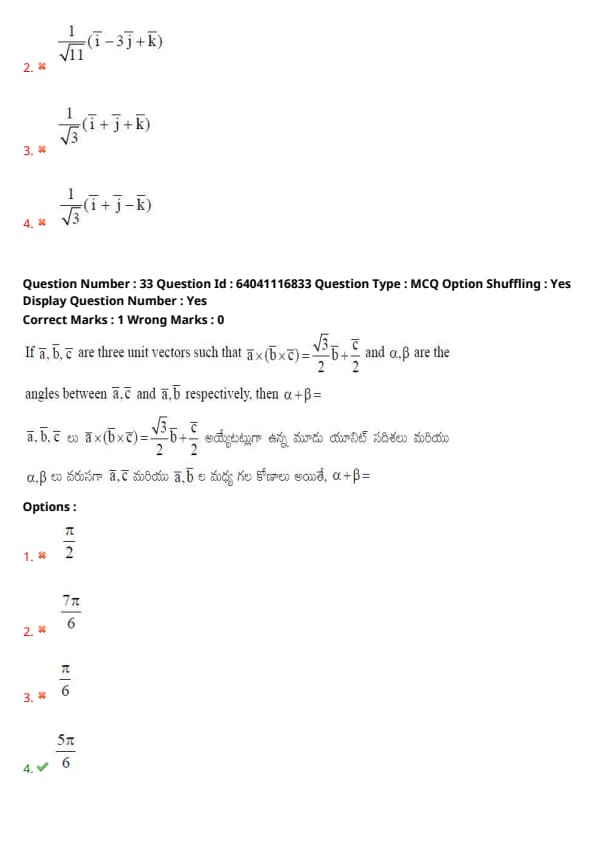 If \( \vec{a}, \vec{b}, \vec{c} \) are three unit vectors such that \( \vec{a} \times (\vec{b} \times \vec{c}) = \frac{\sqrt{3}}{2} \vec{b} + \frac{1}{2} \vec{c} \), and \( \alpha, \beta \) are the angles between \( \vec{a}, \vec{c} \) and \( \vec{a}, \vec{b} \) respectively, then \( \alpha + \beta = ? \)