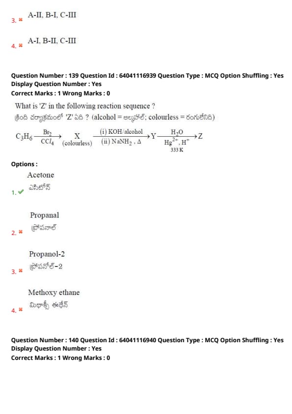 \[ \mathrm{C_3H_6} \xrightarrow[CCl_4]{\mathrm{Br_2}} \mathrm{X} \xrightarrow[\Delta]{i) KOH/alcohol