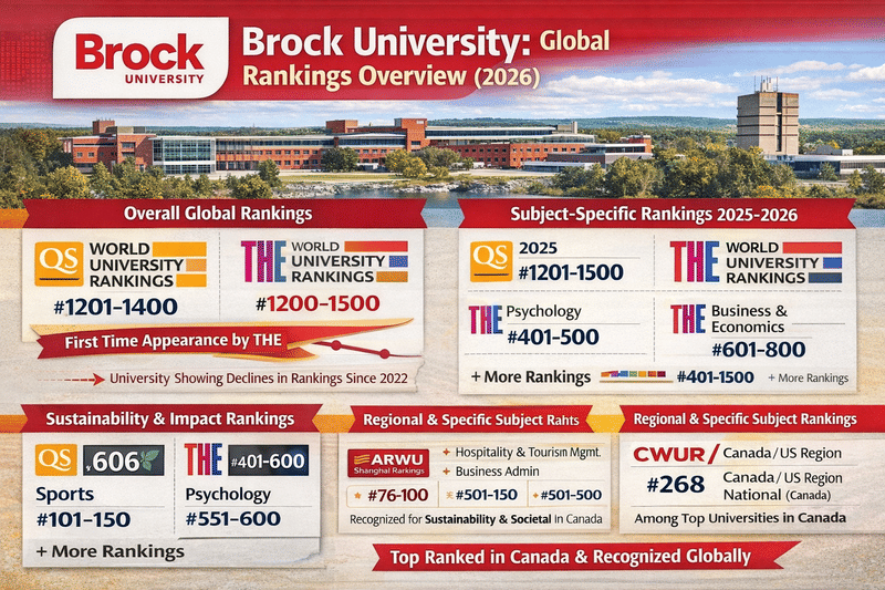 Brock University has seen a decline in rankings from 2022 (#1001-1200) to (#1201-1400) in 2026 as per QS World University Rankings. The University has also been ranked by QS on the Sustainability rankings in 2026 (#606) and Impact rankings by THE in 2025 (#401-600).