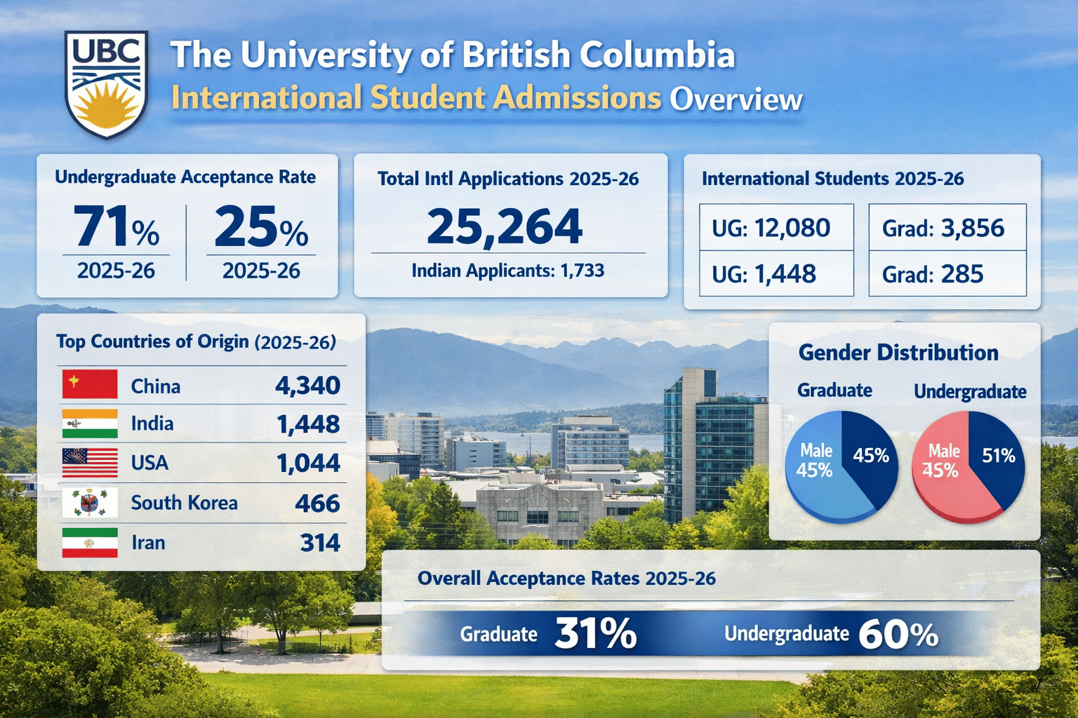 The University of British Columbia acceptance rate data shows that it is one of the most competitive universities in Canada for international students. For 2025-26, the University of British Columbia, Vancouver campus received 25,264 applications from international students for undergraduate and graduate programs.