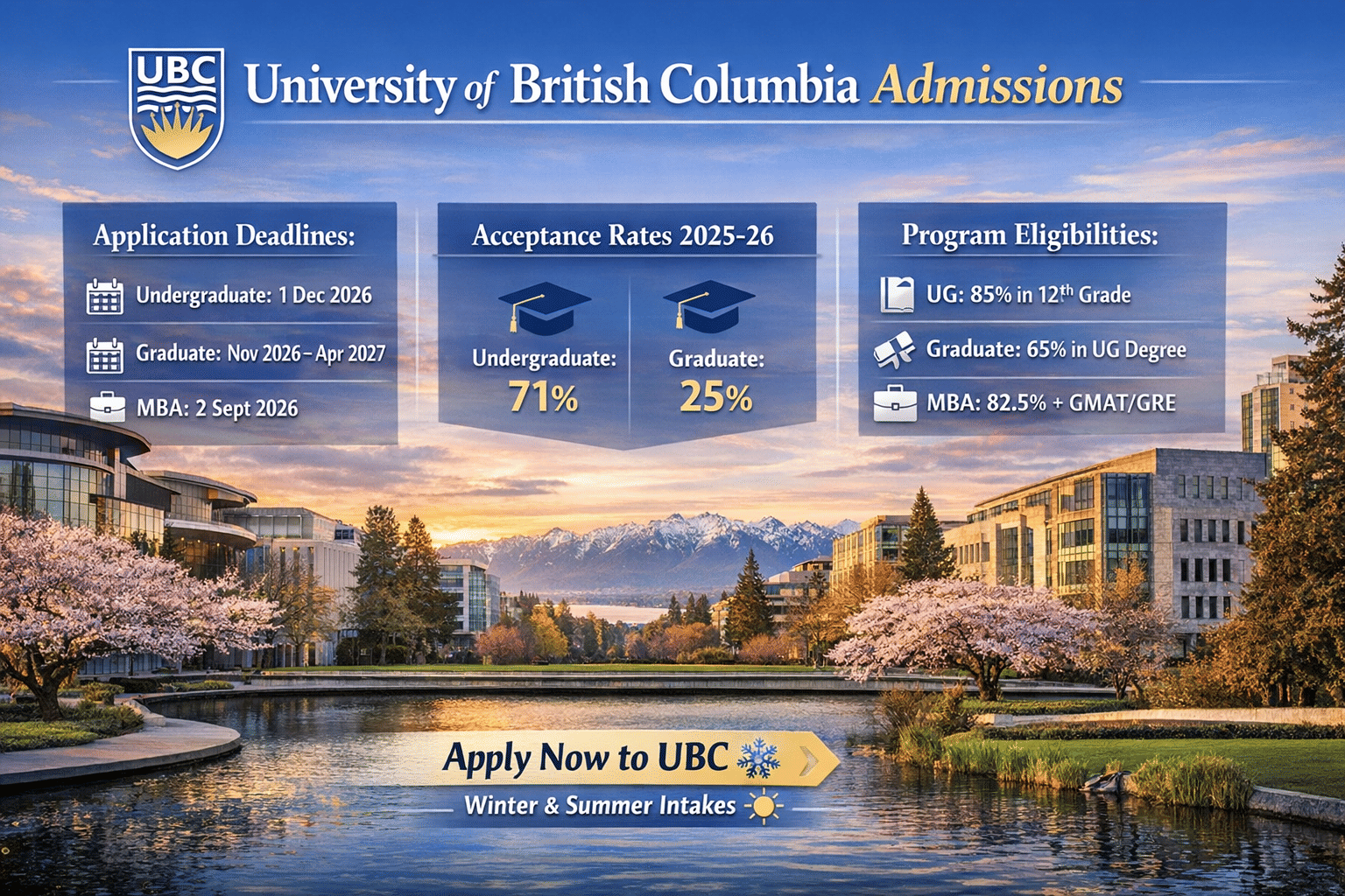 The University of British Columbia sets program-specific deadlines that vary across faculties and intake terms. Summer intake availability is limited and offered only for selected programs. Admission decisions at UBC are generally made in February 2027 - March 2027 (for most of the programs).