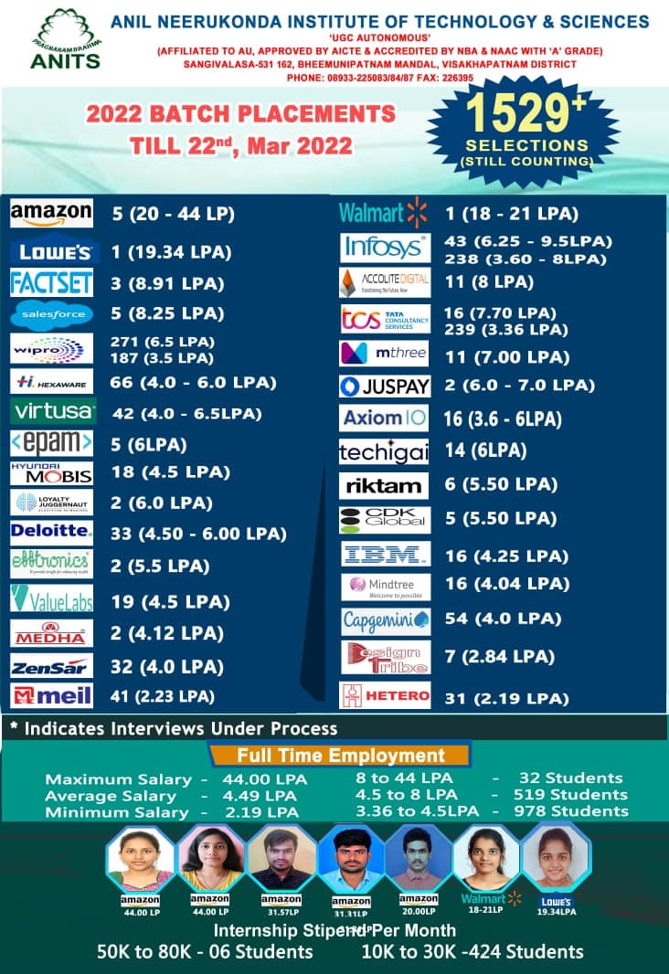 from 6th semester you are eliginle for campus placements. The companies that are visited our college are Axiom Io, Techigai, EPAM, Amazon, Hexaware, Infosys, Hyundai Mobis, Effectronics, Virtusa, Riktham, Capgemini etc... Highest package offered is 44.0 lpa by Amazon comapny. And average package is 5.04 lpa