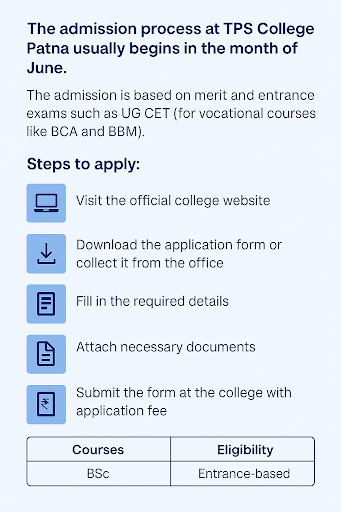 The college has not yet released the specific dates for admission, but students can expect the process to begin around June 2025. Cutoffs are announced post-application, based on available seat intake and merit. TPS College Patna also offers scholarships to meritorious and economically weaker students.