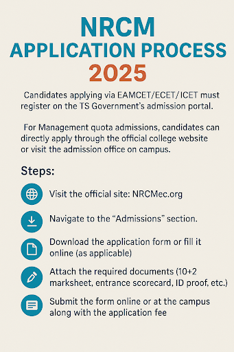 NRCM offers a 4-year full-time B.Tech program across eight specialisations. Admission is granted through TS-EAMCET counselling for Convener Quota seats. The annual tuition fee is INR 70,000 for the first and second years and INR 68,000 for the third and fourth years, totaling INR 2.76 lakhs. Popular branches include Computer Science and Engineering, Artificial Intelligence & ML, and IT.