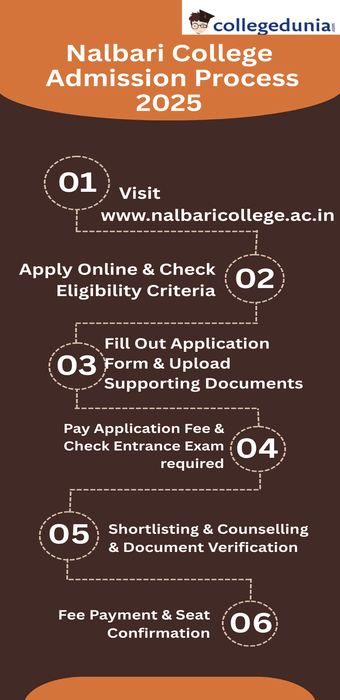 Nalbari College admits undergraduate and postgraduate students on academic merit. For undergraduate programs, students need to have passed their 10+2 exams. For postgraduate programs, a relevant bachelor's degree is required. There is no entrance exam for UG or PG courses, except for some professional programs. Selection is strictly merit-based and subject to reservation policies. Candidates must submit their applications online or offline and then attend counseling and document verification. Below is the tabular form depicting the Nalbari College Admission Process.