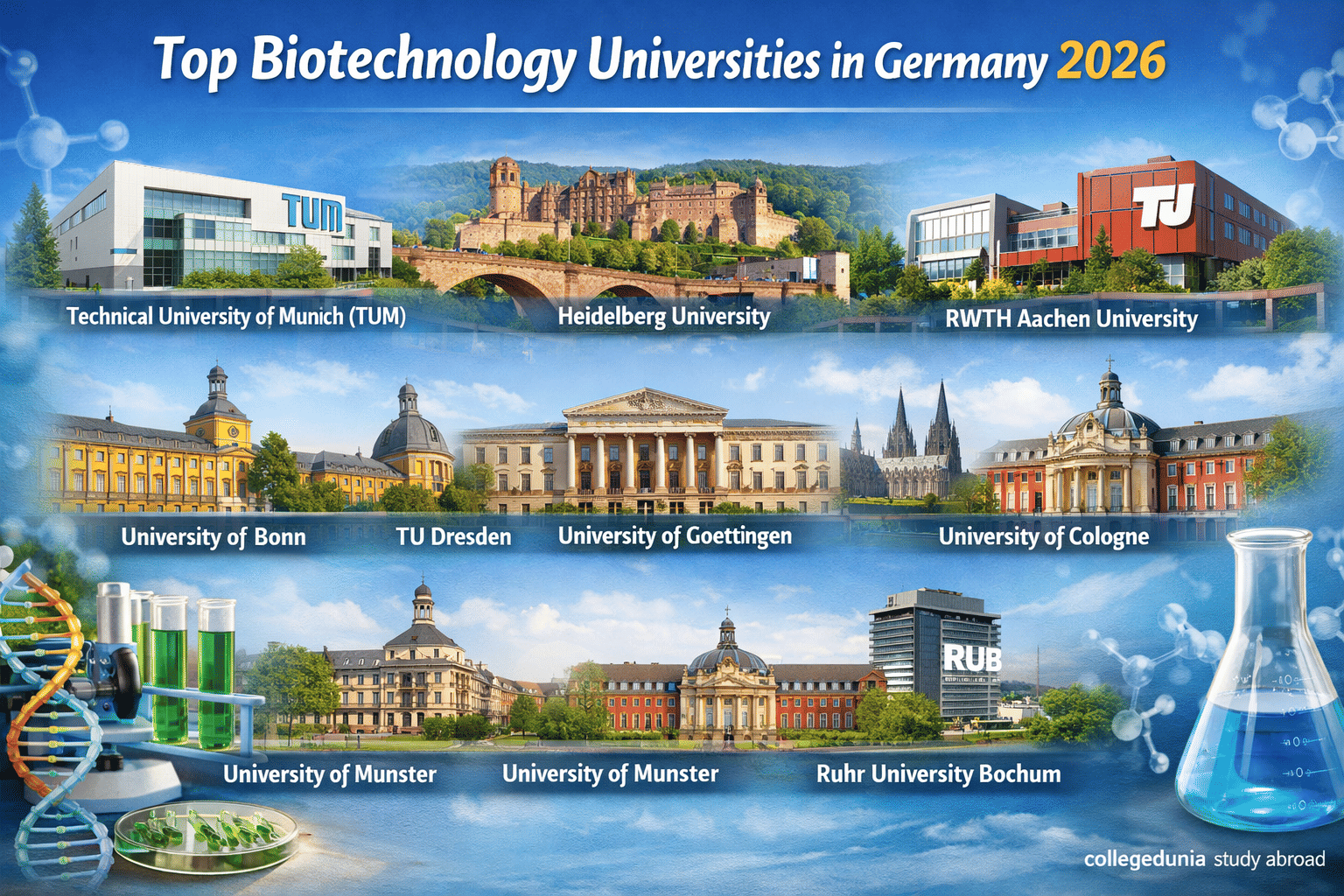 Germany has emerged as a popular study abroad destination for Indian students, with 60,000 enrolments by late 2025. Some of the main reasons are affordable tuition fees, a safe country and scholarship opportunities. Germany offers a wide range of biotechnology programs at the bachelor’s, master’s, and doctoral levels. Most of the public universities in Germany do not charge any tuition fees from international students. However, they charge a certain amount of semester contribution (EUR 97-466) every semester.