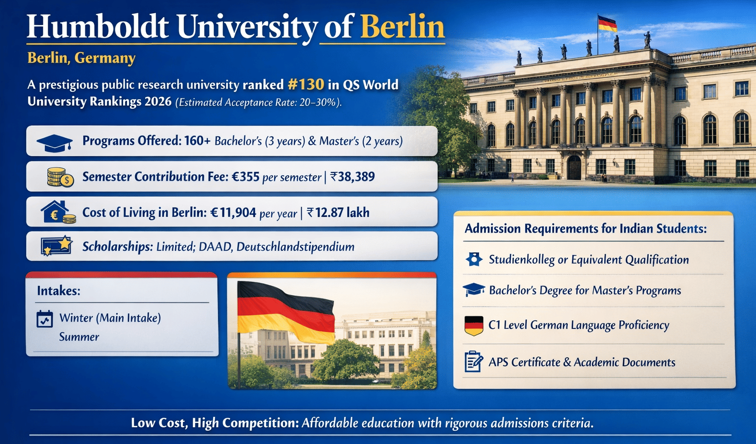 Humboldt University of Berlin is a public research university located in Berlin, Germany. It is widely recognised for its strong academic foundation in humanities, social sciences, natural sciences, and interdisciplinary research. The university does not publish an official acceptance rate; however, third-party sources estimate it to be around 20–30%. As per the latest QS World University Rankings 2026, the university is ranked around #130 globally.