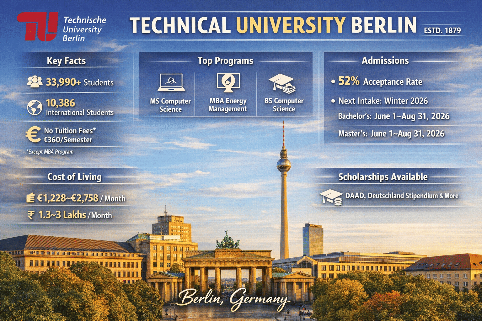 The Technical University Berlin is one of the top universities in Germany. It has been ranked among the top universities by QS (#145) in 2026. It has an acceptance rate of 52% for students, which is considered good. International students need to check all the required details before proceeding with the application.