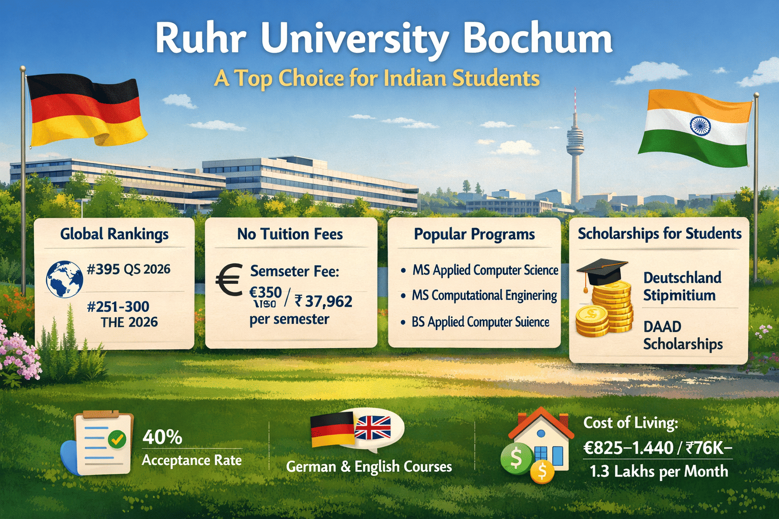The Ruhr University Bochum is one of the top universities in Germany. It has been ranked among the top universities by QS (#395) in 2026. It has an acceptance rate of 40% for students, which is considered good. International students need to check all the required details before proceeding with the application.