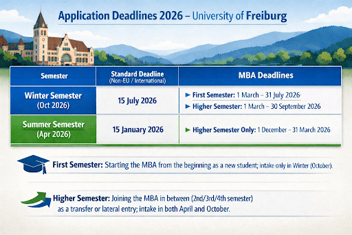 The University of Freiburg offers a 4-semester MBA program, starting each Winter through the Center of Business and Law. Applications for the first-semester close in July, while admissions for higher semesters run from September to March.