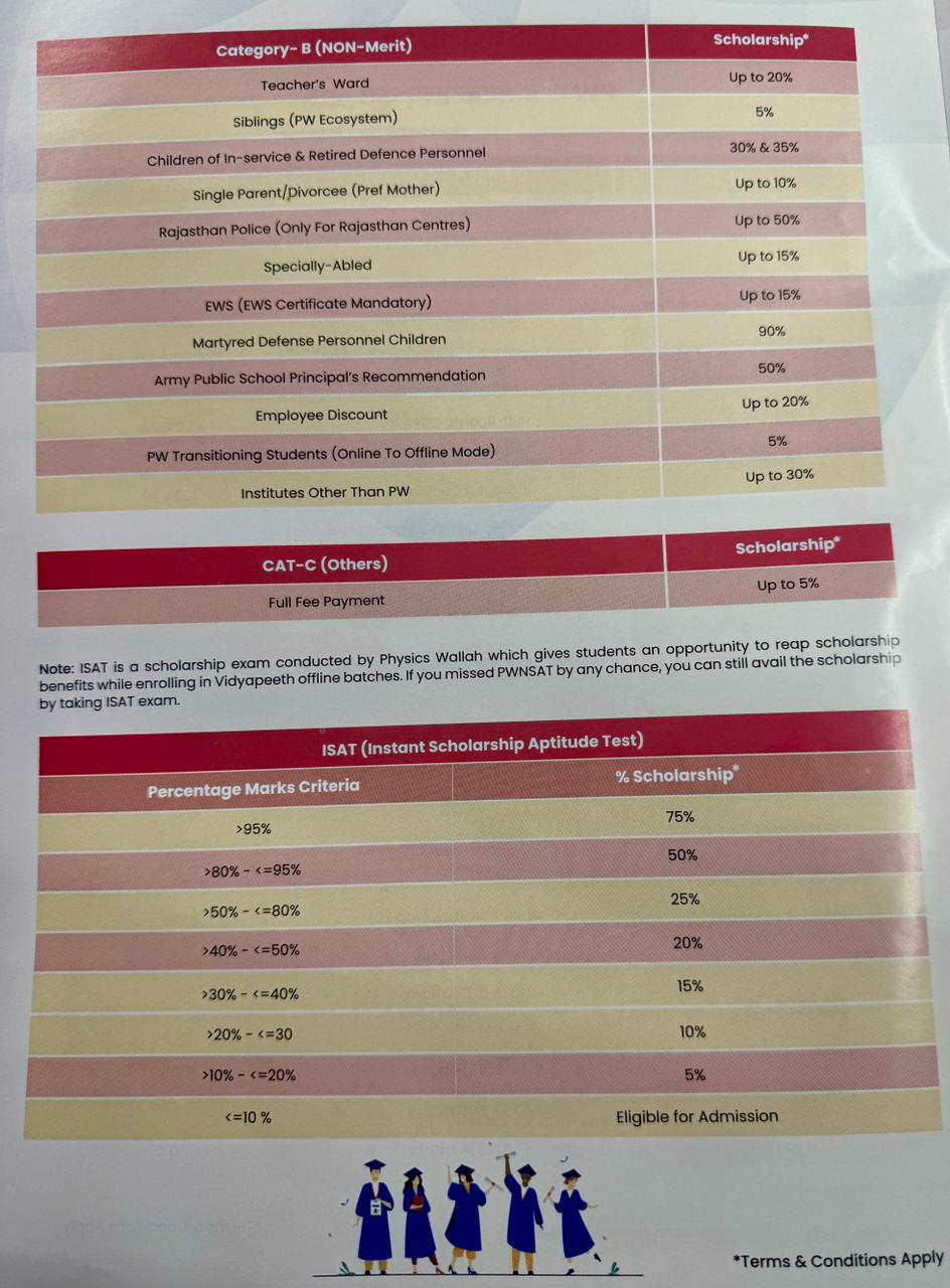 PW also provides scholarships on the basis of Board basis, RMO Basis, State Government Basis and many more. Below is the table of scholarship details