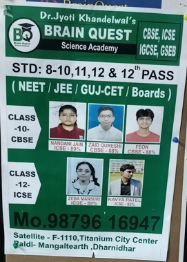 BrainQuest Science Academy, Established in 2012, is one of the most reputed coaching centres located at Titanium City Centre, Ahmedabad which offers coaching for the competitive exams like JEE & NEET, GUJ-CET, CUET and Boards from class 6 - 12 with an average batch size of 10 students per batch.
