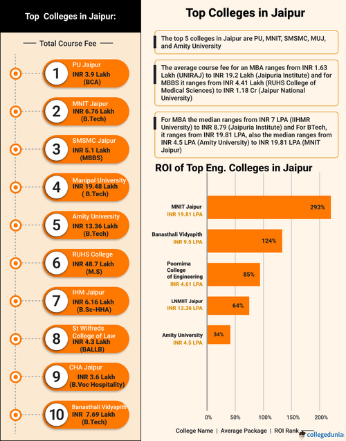 - Fees: The average course fee for an MBA ranges from INR 1.63 Lakh (UNIRAJ - University of Rajasthan) to INR 19.2 Lakh (Jaipuria Institute of Management); for the BTech, the average course fee ranges from INR 4.68 Lakh (SKIT Jaipur) to INR 20.96 Lakh (LNMIIT Jaipur); and for MBBS, the fee ranges from INR 4.41 Lakh (RUHS College of Medical Sciences) to INR 1.18 Cr (Jaipur National University).