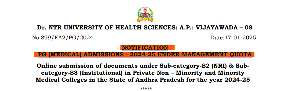 The Dr. NTR University of Health Sciences, Andhra Pradesh, has announced the online submission of documents for candidates seeking admission to PG (Medical) Degree/Diploma courses under the Management Quota for the academic year 2024-25. This submission is specifically for NEET PG 2024 Counselling candidates in the Sub-category-S2 (NRI) and Sub-category-S3 (Institutional) in Private Non-Minority and Minority Medical Colleges across the state. Candidates on the revised final merit list must submit their documents by January 20 (6 PM) with a late fee.