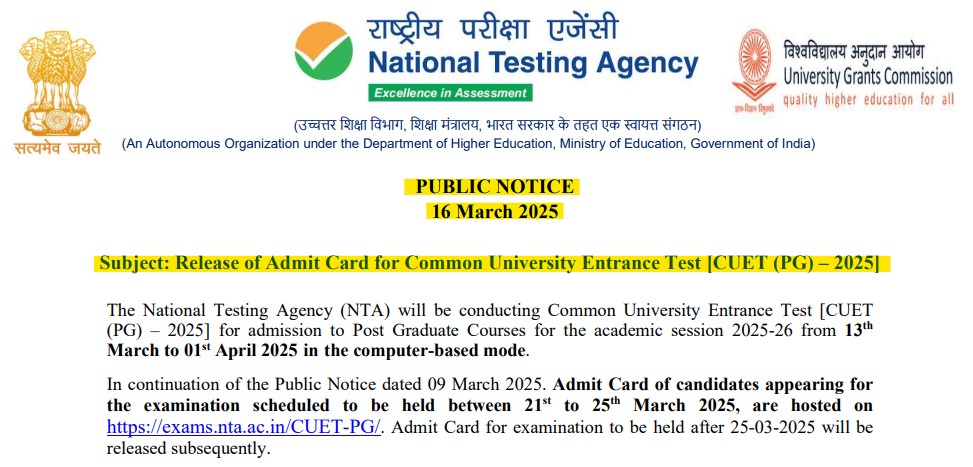 The National Testing Agency (NTA) has released the Admit Card for candidates appearing in the Common University Entrance Test (CUET) PG 2025 between 21 and 25 March 2025. CUET PG 2025 exam, conducted for postgraduate admissions, will take place in computer-based mode from 13 March to 01 April 2025.
