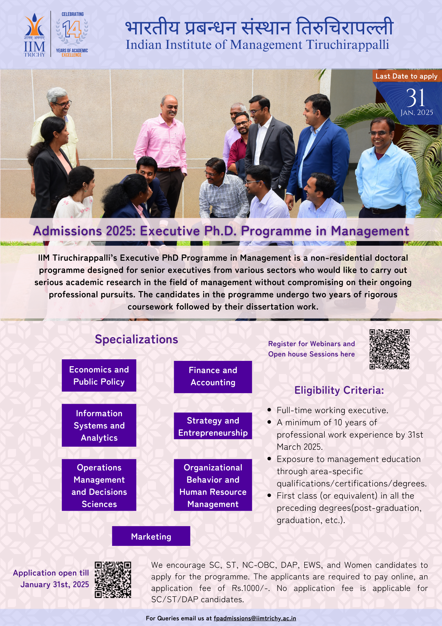 IIM Trichy is inviting applications for admission to the PhD & Executive PhD program in Management. The last date of application is December 31, 2024. An application fee of INR 1,000 is required to pay (no fee for SC/ST/DAP candidates).