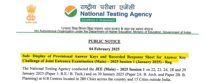 NTA has released the JEE (Main) 2025 Session 1 provisional answer keys and response sheets, allowing candidates to challenge them from February 4 to 6, 2025, via jeemain.nta.nic.in.