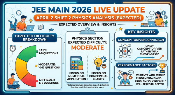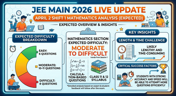 Based on the JEE Main 2026 January 21 Shift 1 Paper Analysis, the difficulty level of JEE Main 2026 April Shift 1 Paper will be moderate to tough.