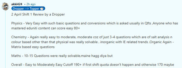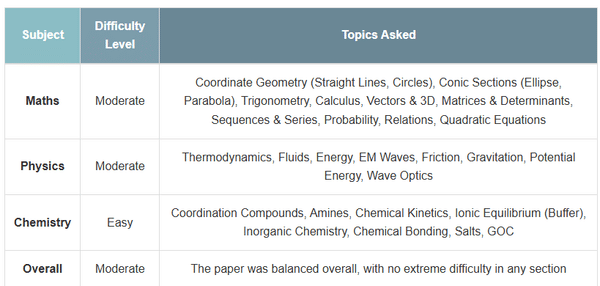 | Overall | Moderate to tough | It was moderate to tough shifts, mainly due to lengthy Maths and calculative Physics |