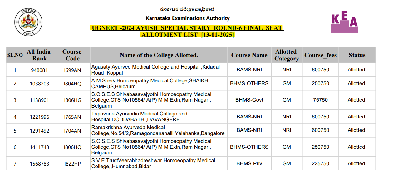 The Karnataka Examinations Authority (KEA) has published the UG AYUSH stray round 6 allotment list for the 2024-25 academic session. Candidates can now access the payment and admission order download link on the official KEA website.