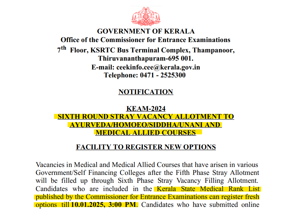 The Kerala Commissioner for Entrance Examinations (CEE) has released notifications regarding the Sixth Round of Stray Vacancy Allotment for admission to AYUSH courses for the academic year 2024-25. Candidates must report to allotted colleges by January 13, 2025, for document verification and fee payment. This process includes Ayurveda, Homeopathy, Siddha, Unani, and Medical Allied Courses, with online facilities for NEET UG 2024 result submission and defect rectification in photos, signatures, and other documents. AYUSH NEET 2024 Counselling 2024