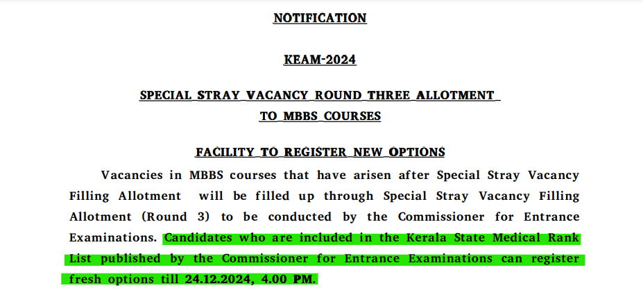 The Office of the Commissioner for Entrance Examinations (CEE), Kerala, has started the option registration process for the Special Stray Vacancy Round 3 to fill the remaining MBBS seats. The option registration will close at 4:00 PM today, December 24, 2024. This round aims to address vacant seats arising after previous allotments. Eligible candidates can now register their options online. Kerala NEET UG Counselling 2024
