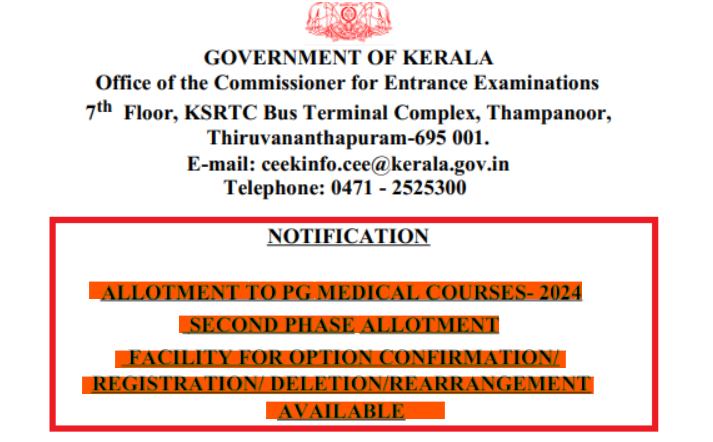The Commissioner for Entrance Examinations (CEE), Kerala, has released the schedule and details for the second phase of centralized allotment for Post Graduate Medical Degree Courses. The allotment process begins on December 12, 2024.