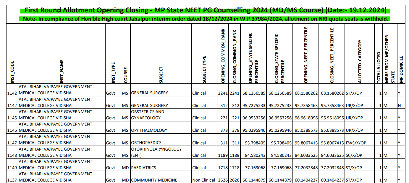 The Department of Medical Education (DME), Madhya Pradesh, has announced the seat allotment results for the first round of MP NEET PG Counselling 2024, facilitating admissions to MD/MS/PG Diploma courses in medical colleges across the state. Candidates allotted seats must report in person for document verification between December 21, 2024, and December 31, 2024. This process aims to provide admissions to MD/MS/PG Diploma courses in medical colleges across the state. NEET PG 2024 Counselling