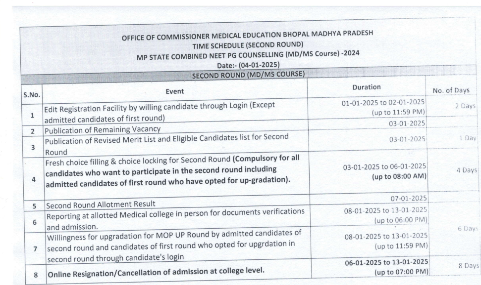 - Seat Allotment Result: The allotment results will be announced on January 7, 2025, and candidates can check their results on the official MP NEET PG counselling portal.