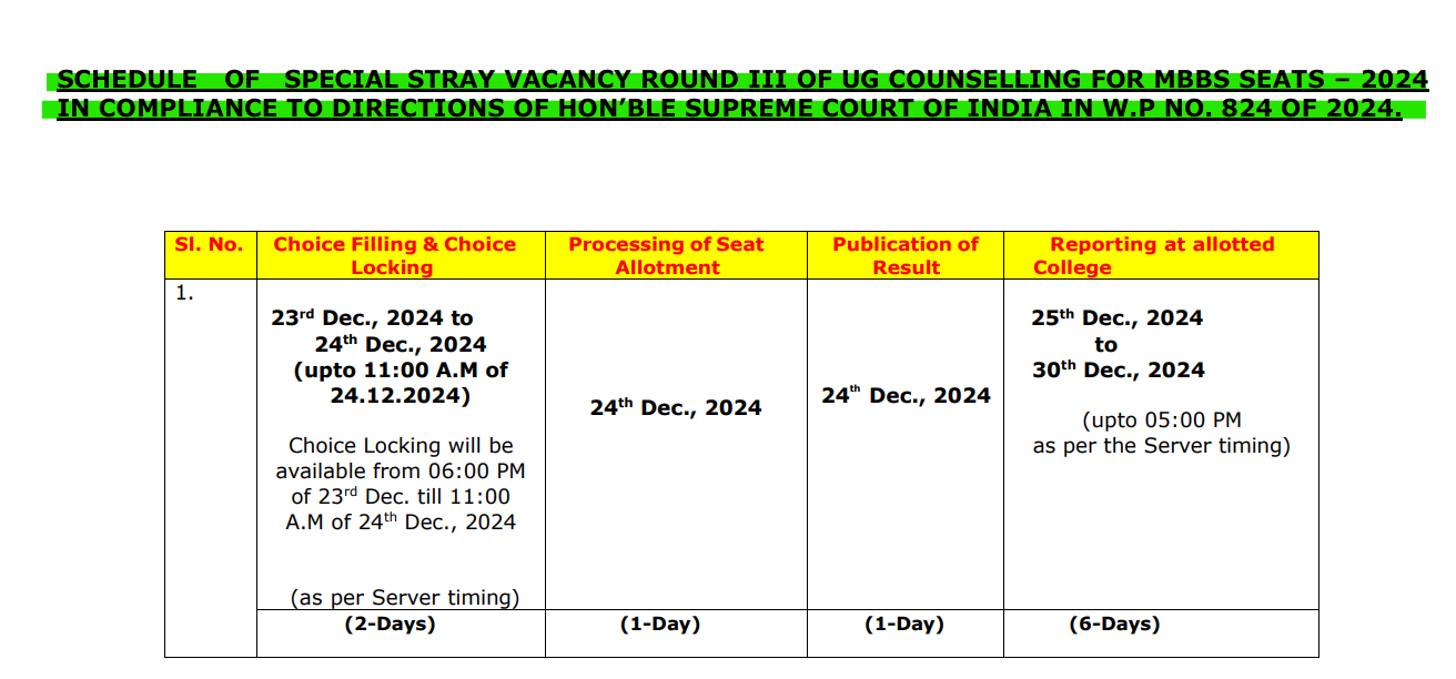 The Medical Counselling Committee (MCC) has announced the schedule for the Special Stray Vacancy Round III for MBBS seats under the NEET UG 2024 Counselling. This round is conducted in compliance with the directions of the Hon’ble Supreme Court of India in W.P No. 824 of 2024. The schedule includes important dates for choice filling, seat allotment, result publication, and reporting. NEET UG 2024 Counselling
