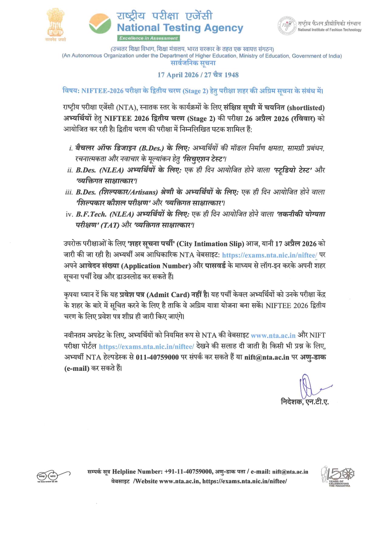 The National Testing Agency (NTA) has released the city intimation slip for NIFTEE 2026 Stage 2 undergraduate examination on April 17, 2026. Shortlisted candidates can now download their city intimation slip by logging into the official NTA portal at exams.nta.nic.in/niftee using their application number and password.