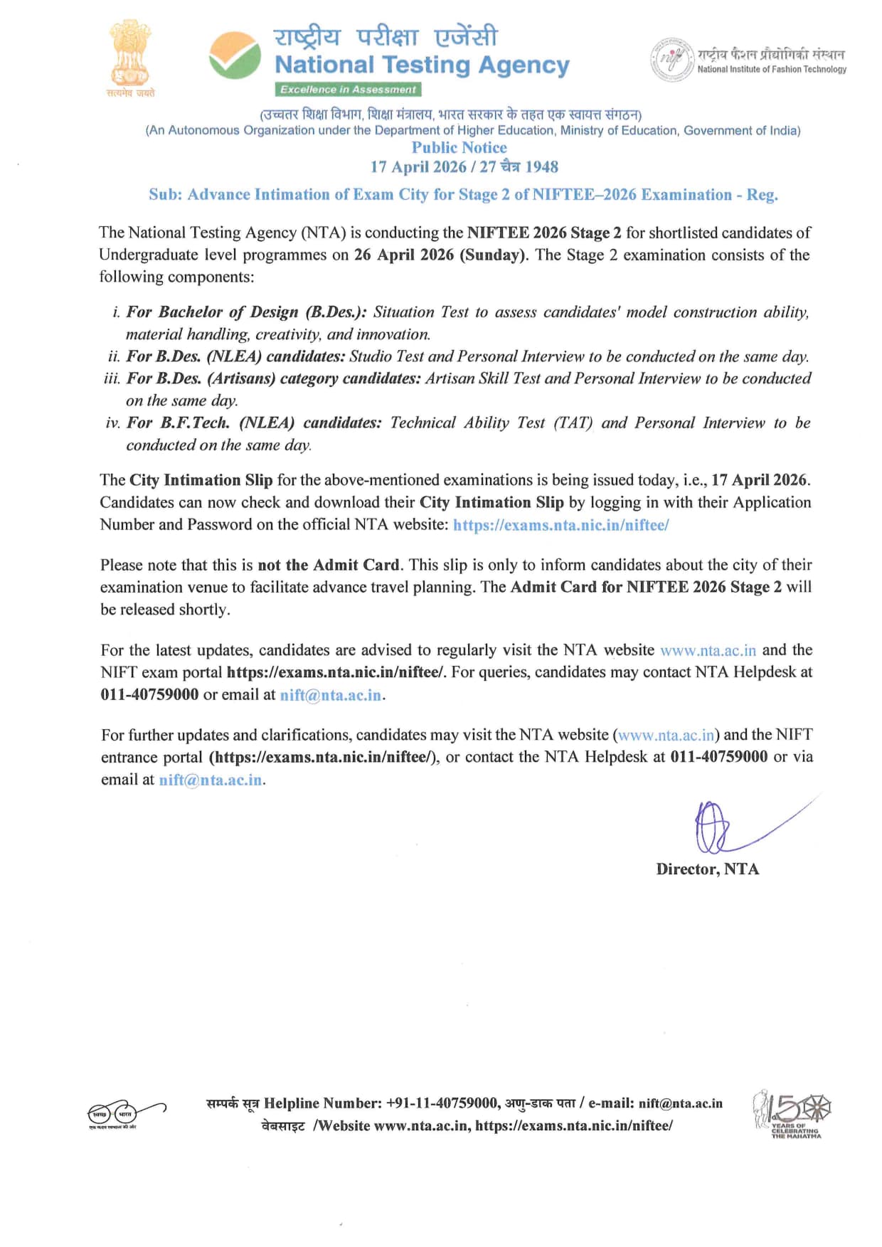 NTA released NIFTEE 2026 Stage 2 UG city intimation slip on April 17, 2026. Shortlisted candidates can download their slip from exams.nta.nic.in/niftee using application number and password. The Stage 2 exam is scheduled for April 26, 2026 (Sunday).