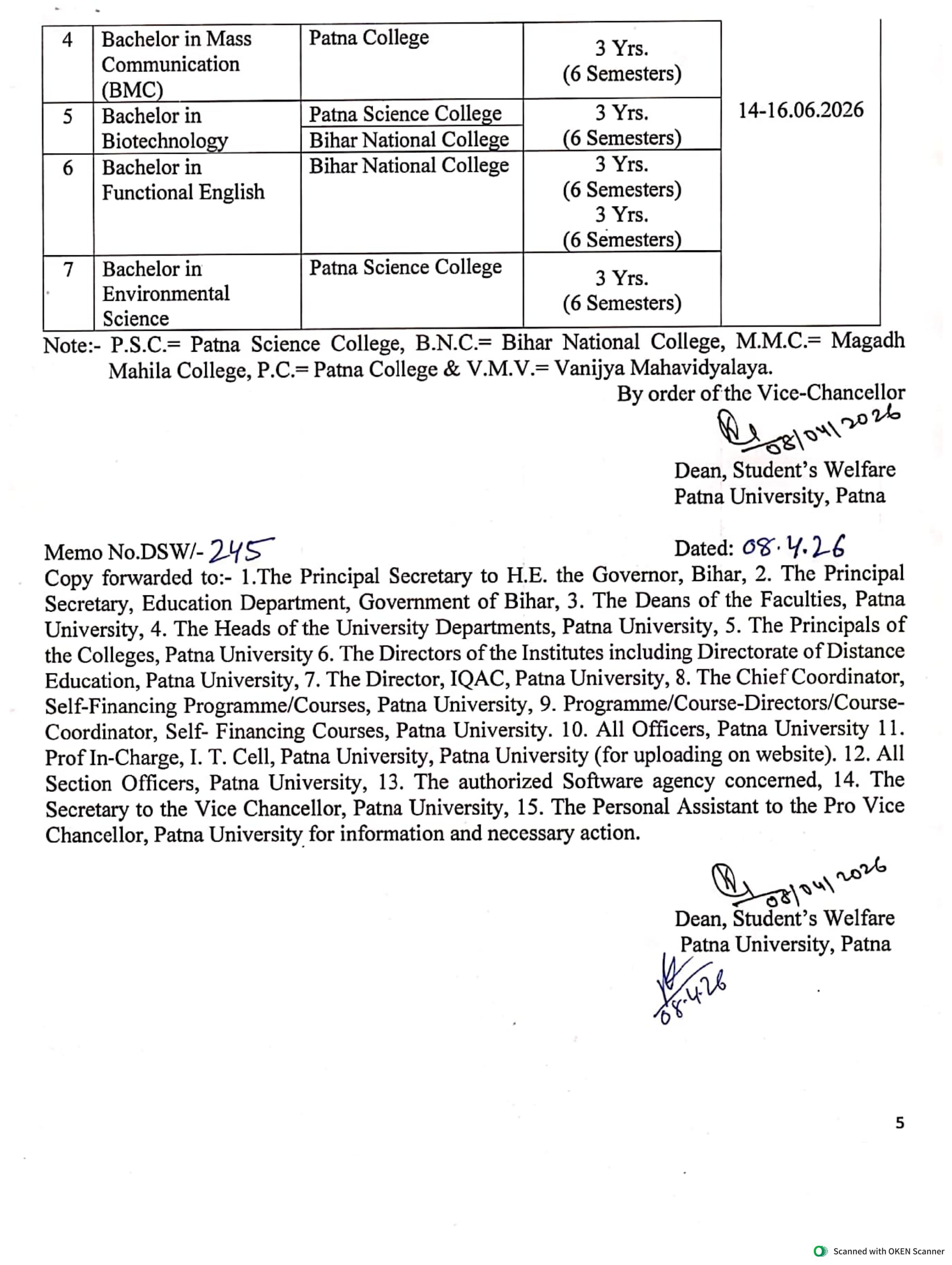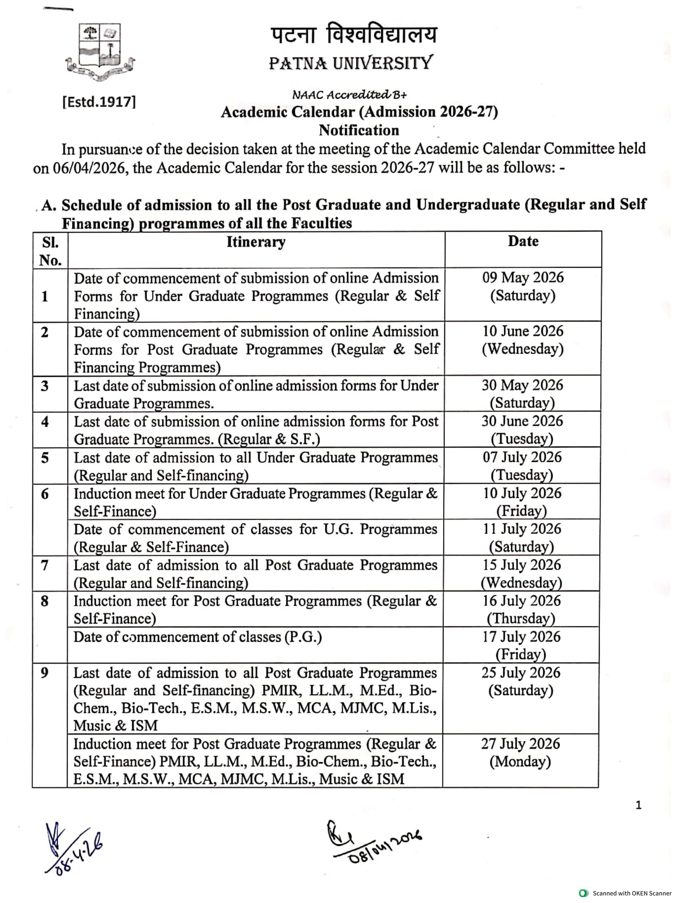 Patna University releases Academic Calendar 2026–27: UG forms open May 9, exams June 12–14; PG admissions start June 10; classes begin July 11 (UG) and July 17 (PG).