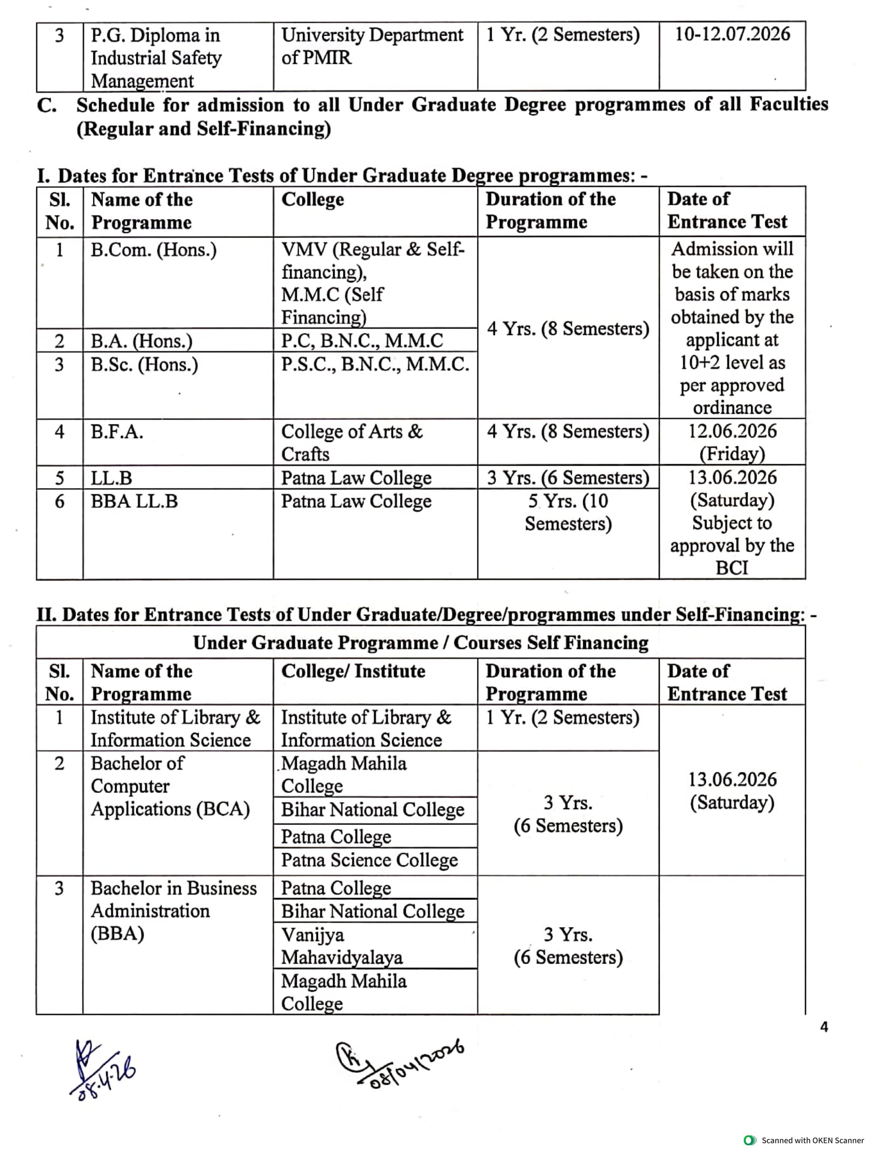 Patna University (PU) has released the Admission Schedule and Academic Calendar for the session 2026-27. According to the official notification, the application process for various Undergraduate (UG) and Postgraduate (PG) programs is set to begin soon, with entrance examinations scheduled between June 10 and June 20, 2026, and the first merit list expected on June 25, 2026.