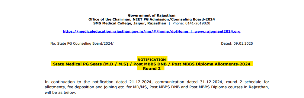 Rajasthan NEET PG Counselling Board has released the detailed schedule for Round 2 of the NEET PG Counselling 2024. This phase includes allotments for MD/MS, Post MBBS DNB, and Post MBBS Diploma courses in government and private institutions across the state. The provisional seat allotment list will be published on January 16, 2025, with subsequent steps outlined for fee deposition and reporting. NEET PG Counselling 2024