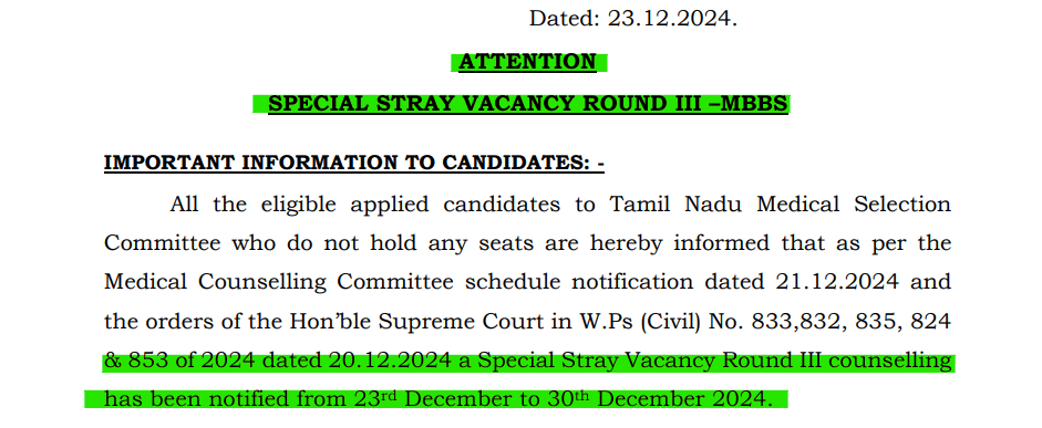 Tamil Nadu NEET Special Stray Vacancy Round III for MBBS admissions begins today, December 23, 2024, with registration and choice filling open until December 24, 12:00 Noon. Results will be announced on December 25, 2024.