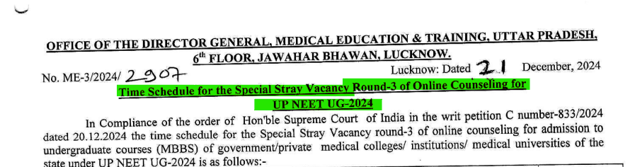 The Office of the Director General, Medical Education & Training, Uttar Pradesh, has announced the schedule for the Special Stray Vacancy Round-3 of the UP NEET UG-2024 online counseling. This round is conducted in compliance with the Hon’ble Supreme Court's order dated December 20, 2024, in Writ Petition (C) No. 833/2024. It offers eligible candidates a final opportunity to secure admission to MBBS courses in government and private medical colleges across Uttar Pradesh. UP NEET Counselling 2024