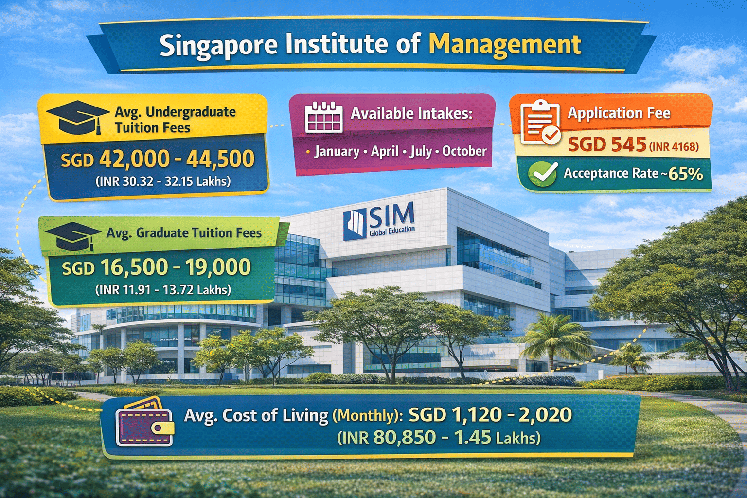 | Monthly Total COL (apart from tuition fee) | SGD 1,120 - 2020 | INR 80,850 - 1.45 Lakhs |