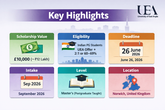 The scholarship reduces the cost of studying in the UK while offering access to international exposure, research opportunities, and global career pathways. With a clear focus on leadership and impact-driven education, the University of East Anglia (UEA) positions itself as a strong choice for Indian postgraduate applicants in 2026.