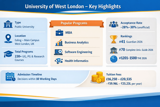 University of West London (UWL) offers 200+ programs across bachelor's and master’s degrees. The University accepts admission in 3 intakes: January, May and September. Postgraduate admissions are conducted on a rolling basis with no fixed deadline, allowing students to apply throughout the year. In contrast, undergraduate applications are submitted via UCAS. whose equal consideration deadline has passed, but UCAS Extra remains open until June 30, 2026. The university does not officially disclose its acceptance rate, estimates from unofficial sources suggest it falls between 28% and 30%.