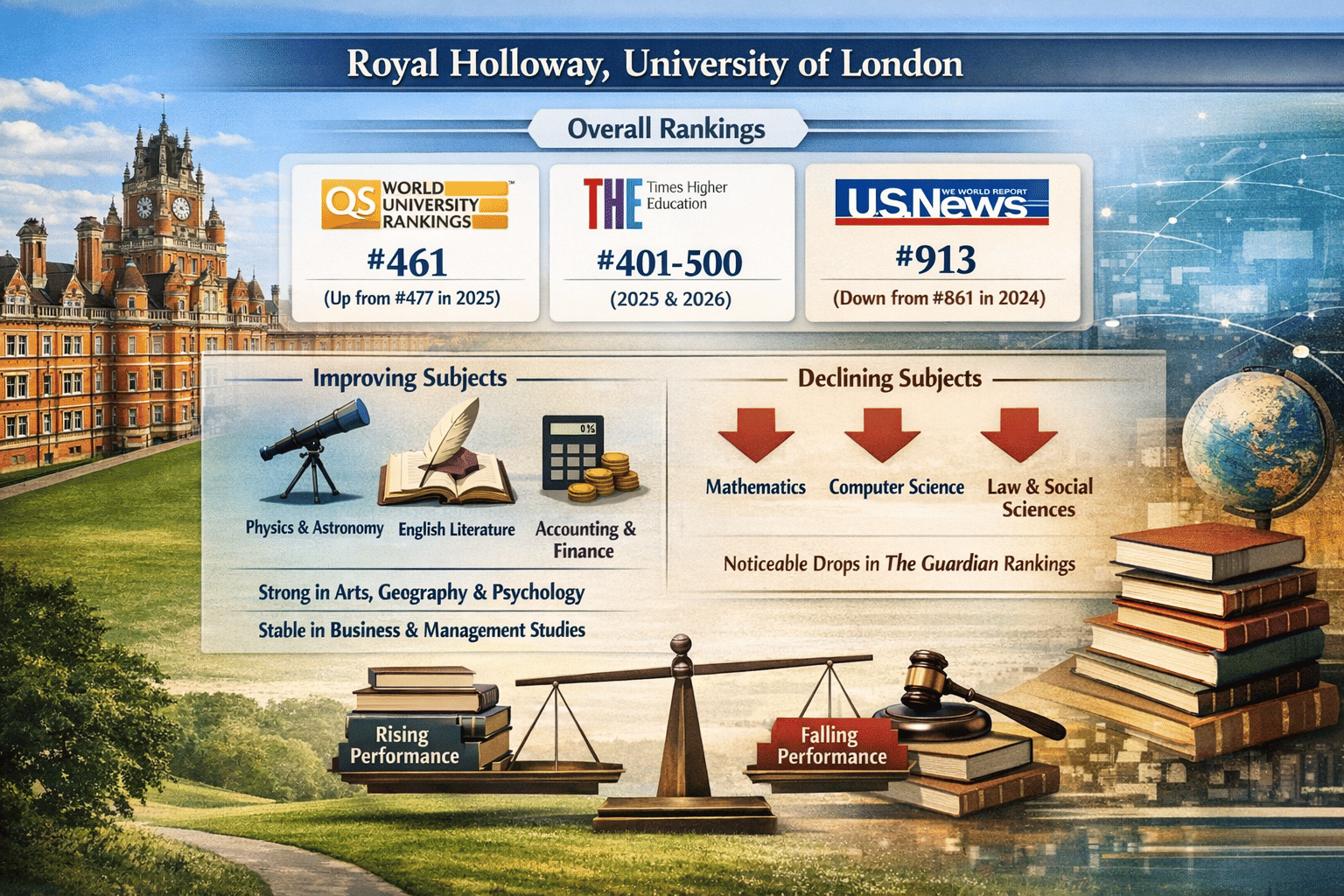 Summary: Royal Holloway, University of London, shows a mixed trend from 2024–2026, with a slight improvement in QS rankings, stable performance in THE, and a decline in U.S. News rankings.