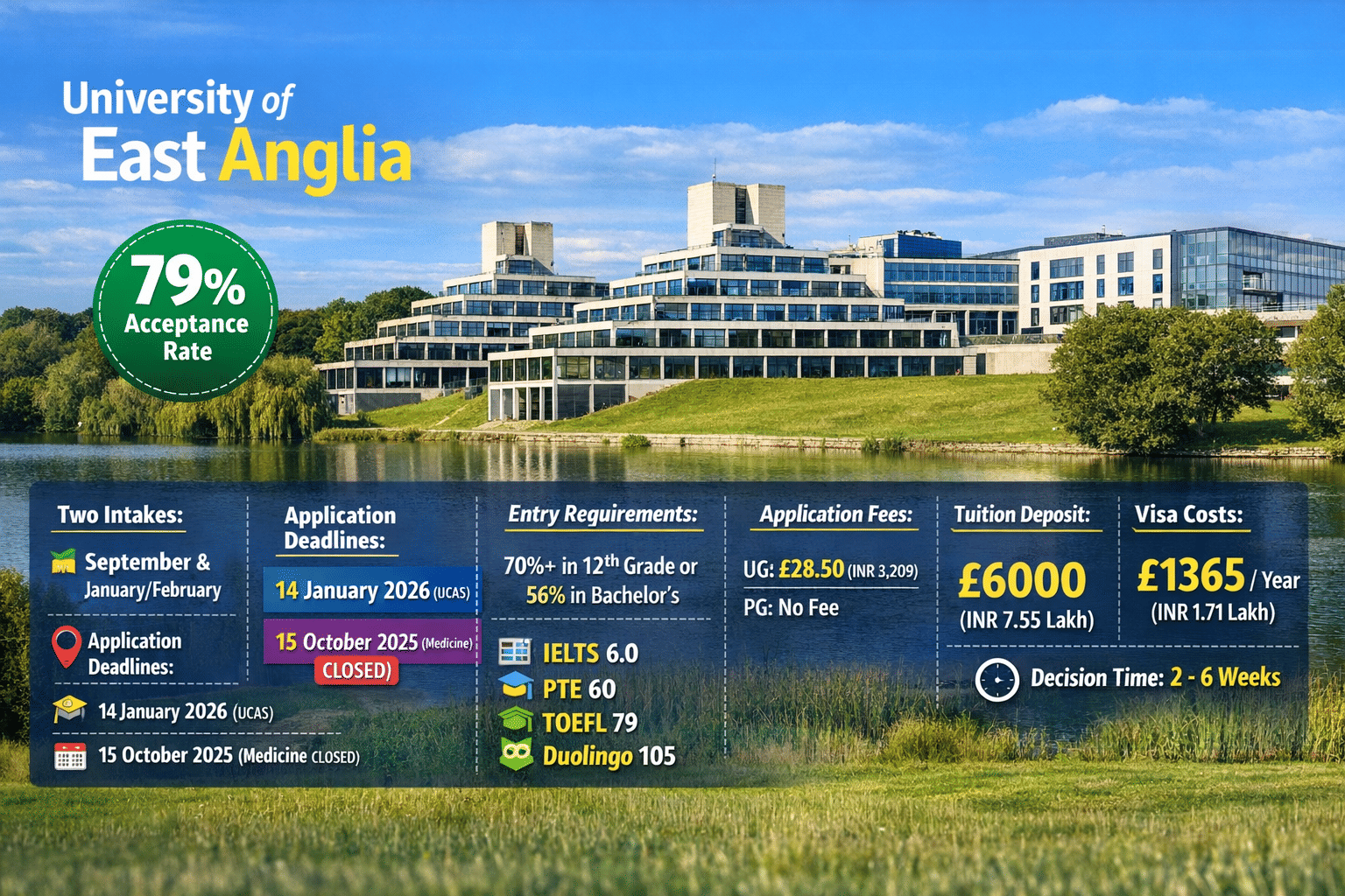 The University of East Anglia (UEA) offers a well-structured and accessible admission process for international students, including those from India. With an estimated acceptance rate of around 79%, the university is considered moderately competitive, giving well-prepared students a fair chance of securing admission. UEA follows a two-intake system (September as the primary intake and January/February as a secondary intake), allowing flexibility for applicants.